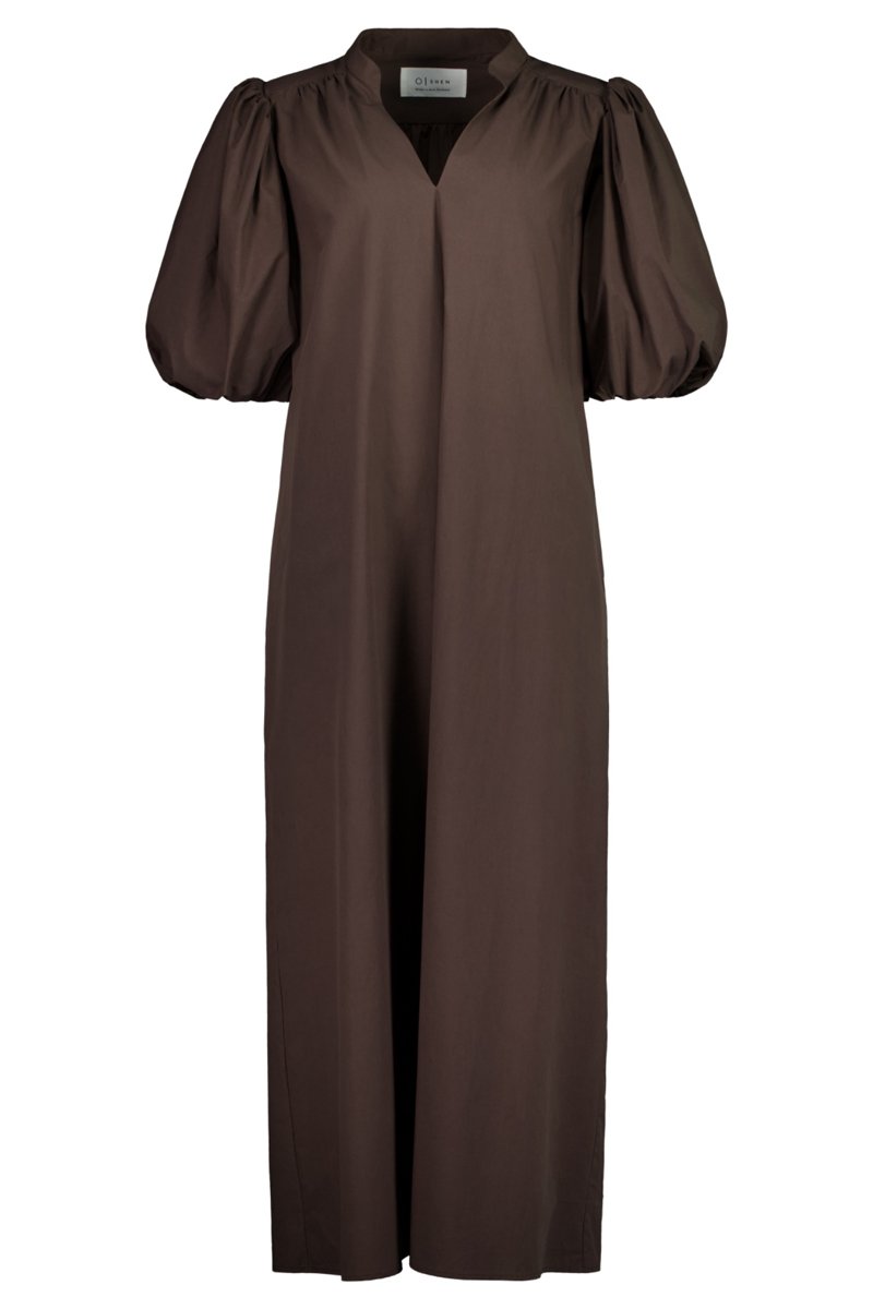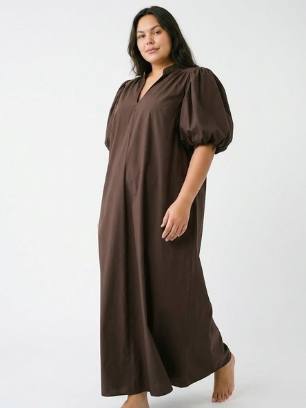 A beautifully crafted dress in pure cotton, defined by its double-layered gathered sleeve with soft elastic that falls into a voluminous puff. This ankle-length dress is designed for effortless elegance and ease. The refined V-neck with a Nero collar lends a tailored touch, while hidden side pockets bring everyday practicality. Midweight crisp cotton with structure, offers a clean, modern silhouette.