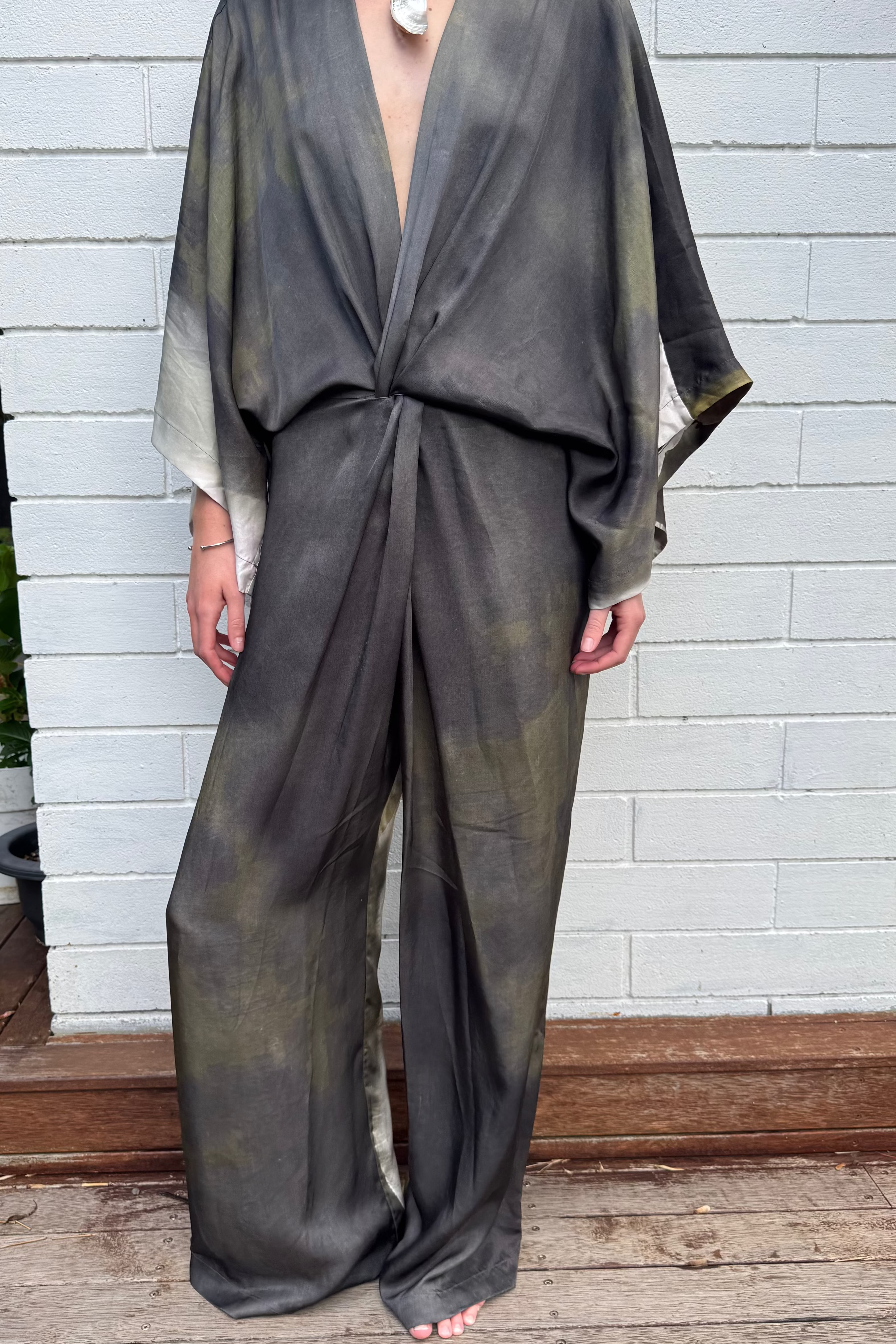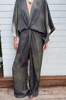 Kimono jumpsuit is based off our classic Kimono. A knot feature at the waist creates a beautiful flattering detail. An elegant design in a figure flattering style. The back is gathered to create a blousing effect. Fabric has very little crease.