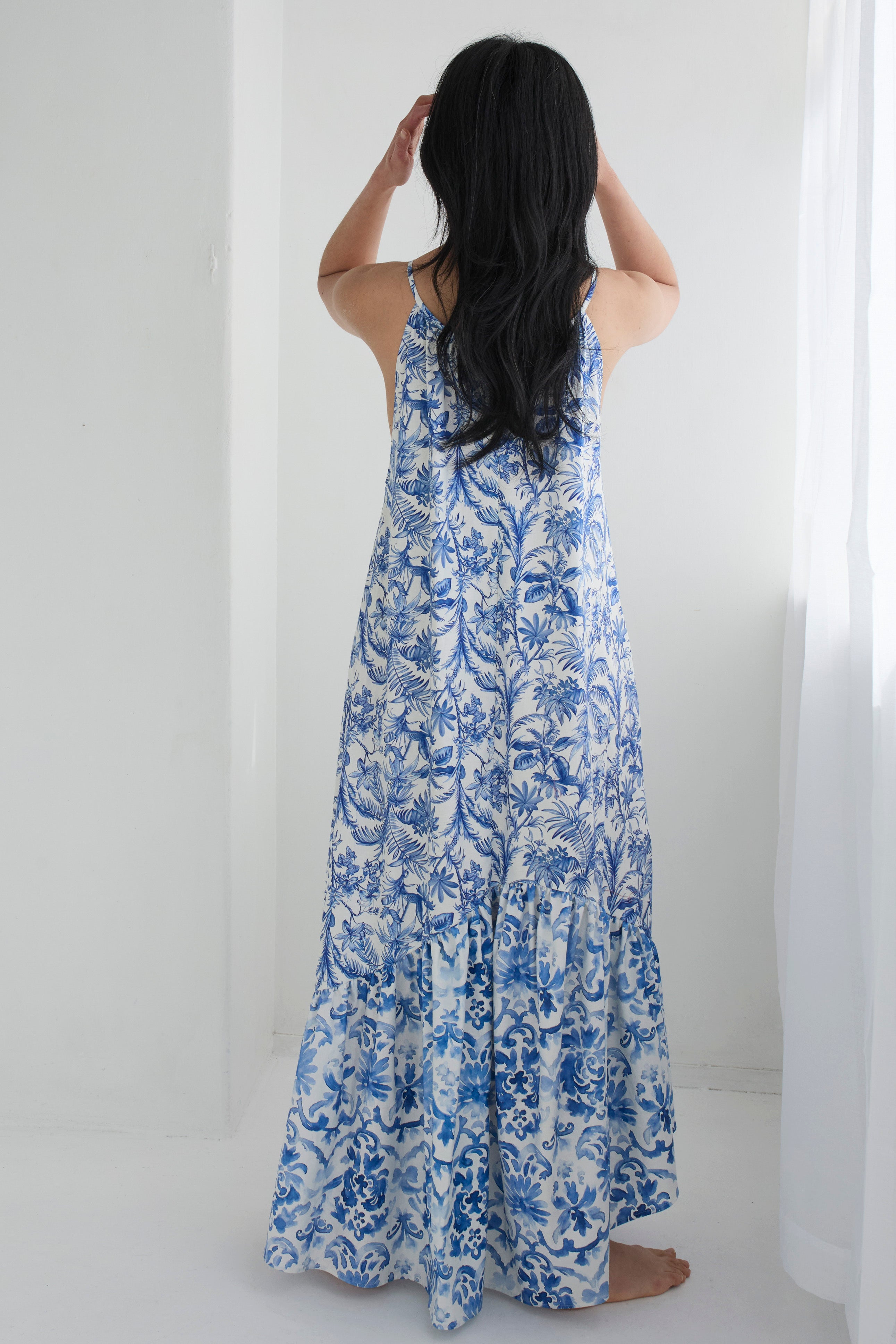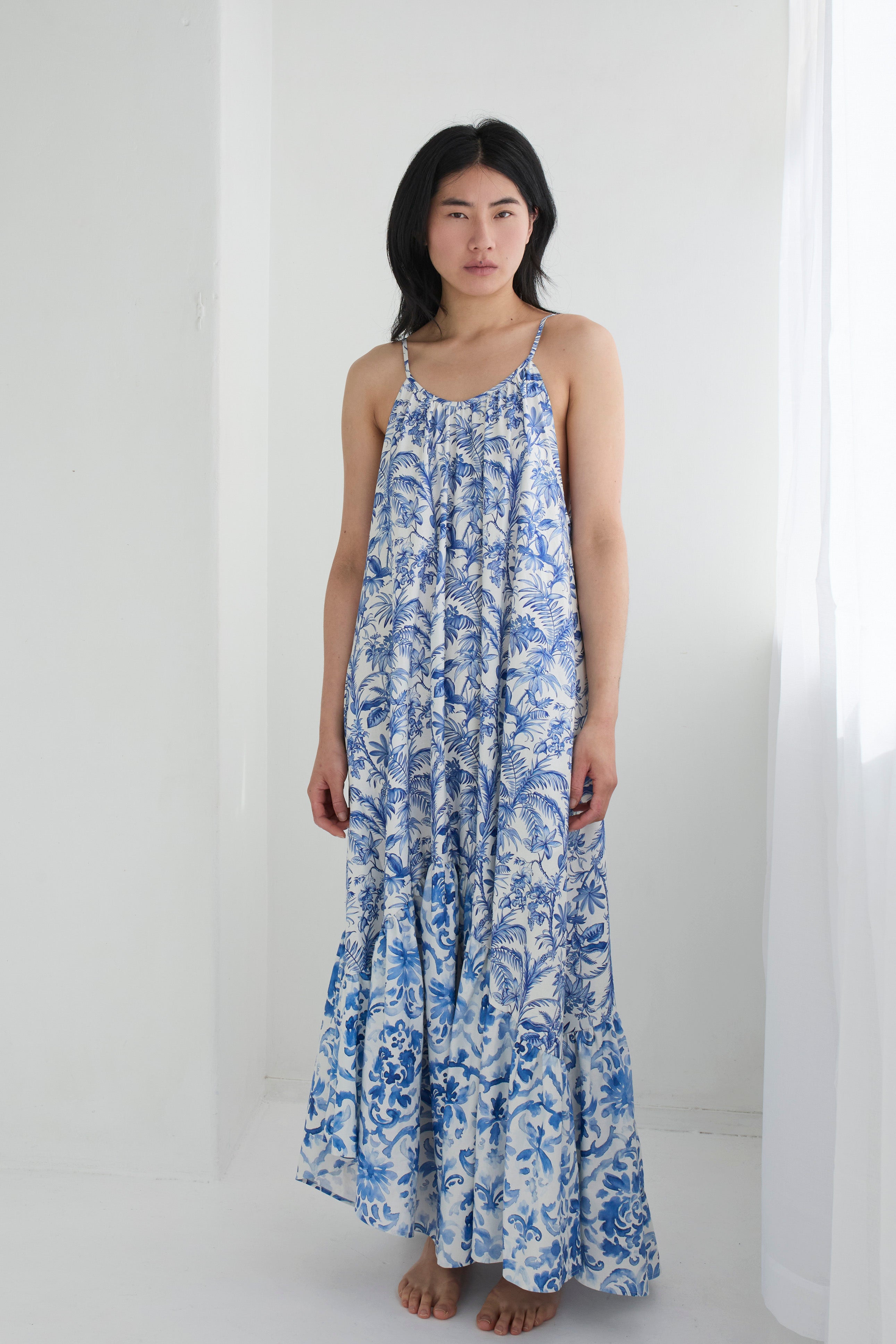 A beautifully crafted dress  in pure cotton, defined by its generous gathered hem detail. This maxi dress is designed for effortless elegance and ease. The soft gathered round neck falls to an A line shape, while hidden side pockets bring everyday practicality. Mid weight crisp cotton drapes with a clean, modern silhouette.